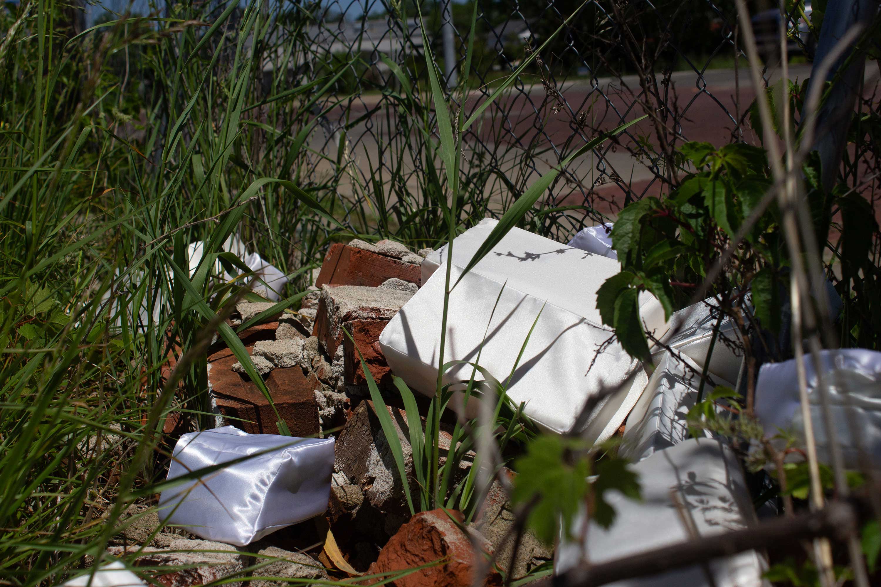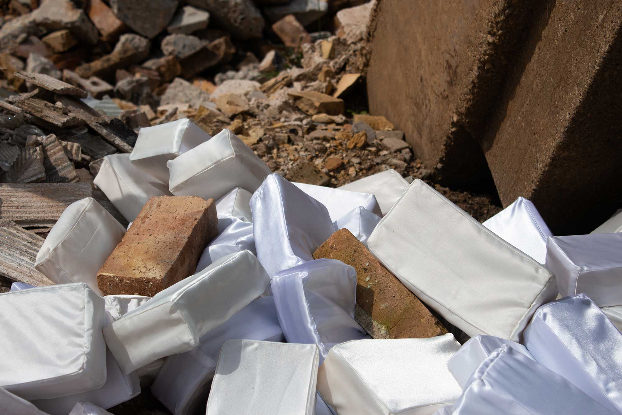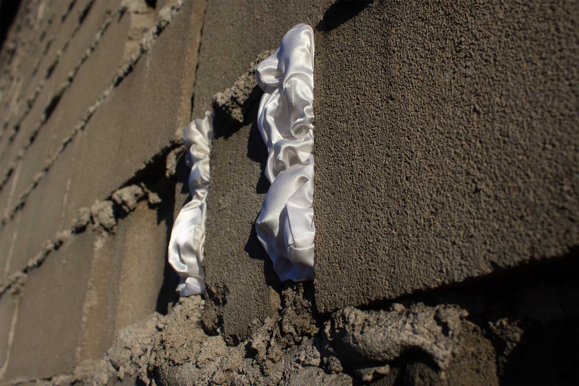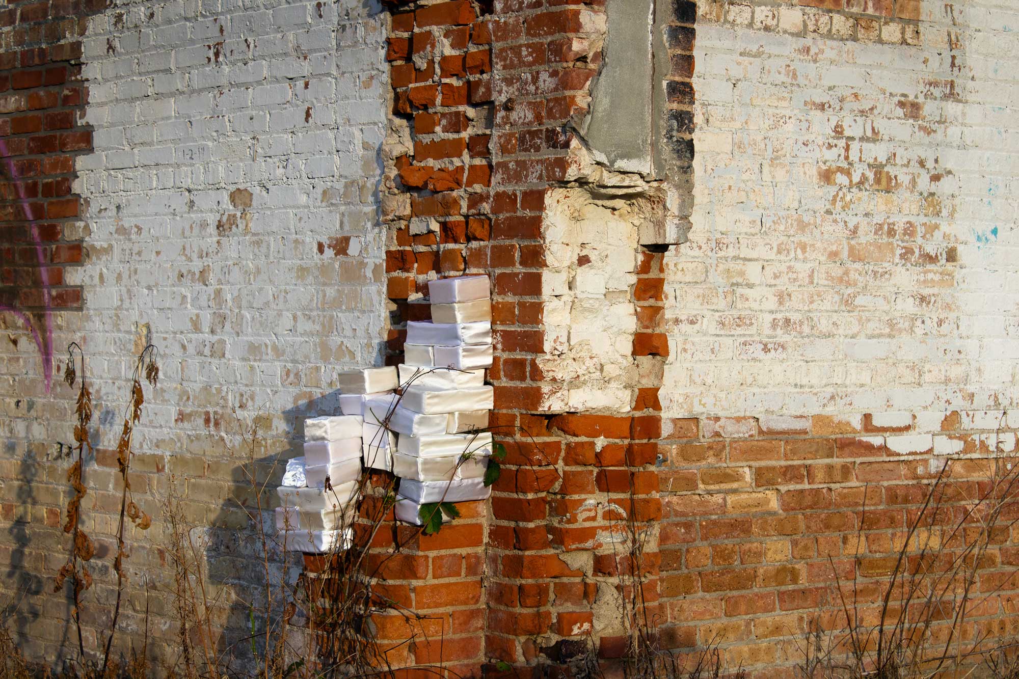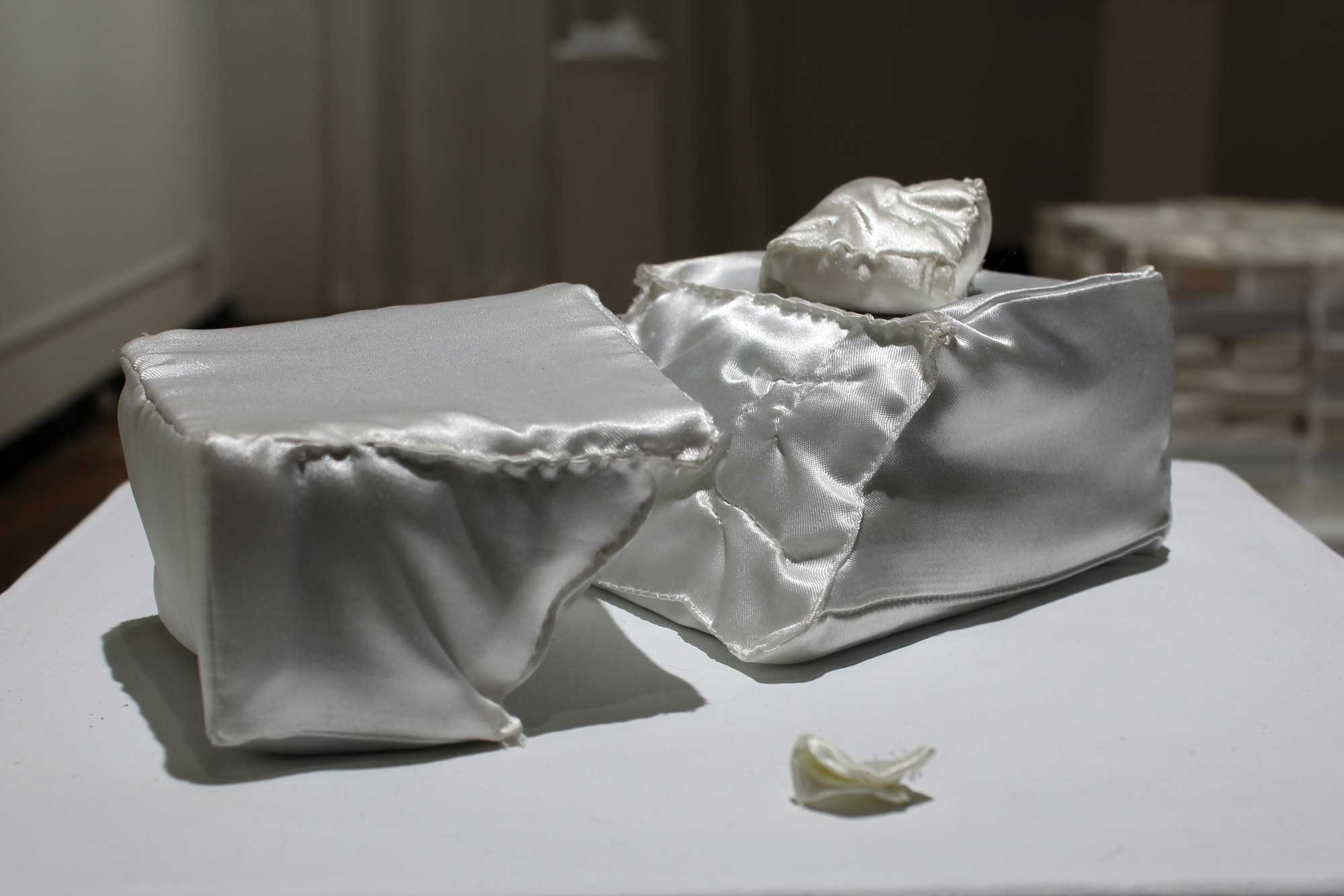 Bricks (I’d Like to Build a Shelter) is an ongoing project in which I sew satin bricks and then use them for interventions, installations, and performances in the built environment. This project addresses moments of failure and collapse within both physical and social structures; labor, including the labor by which those structures are built, maintained, and repaired; gendered labor specifically and gender in general; safety; shelter; and white womanhood.