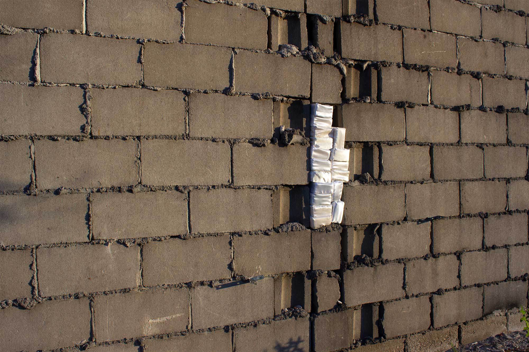In this project, I use bricks to refer to the literal and metaphorical structures of our world, including walls, roads, and borders, as well as gender, race, and class. I make the brick soft, shiny, and lavish, while also rendering it floppy, flaccid, and non-functional. Foregrounding the labor by which physical and social structures are built and maintained, I reconstruct the moments when they droop, fail, and collapse. I explore failure as a site of possibility and pleasure, and I work with textiles for their droopiness; their frequent failure to hold their own shape; and for their pleasurable softness when held against one’s skin. Forever interested in instability, emptiness, and the desire to be filled, I turn to absence as a signal of that which might be.