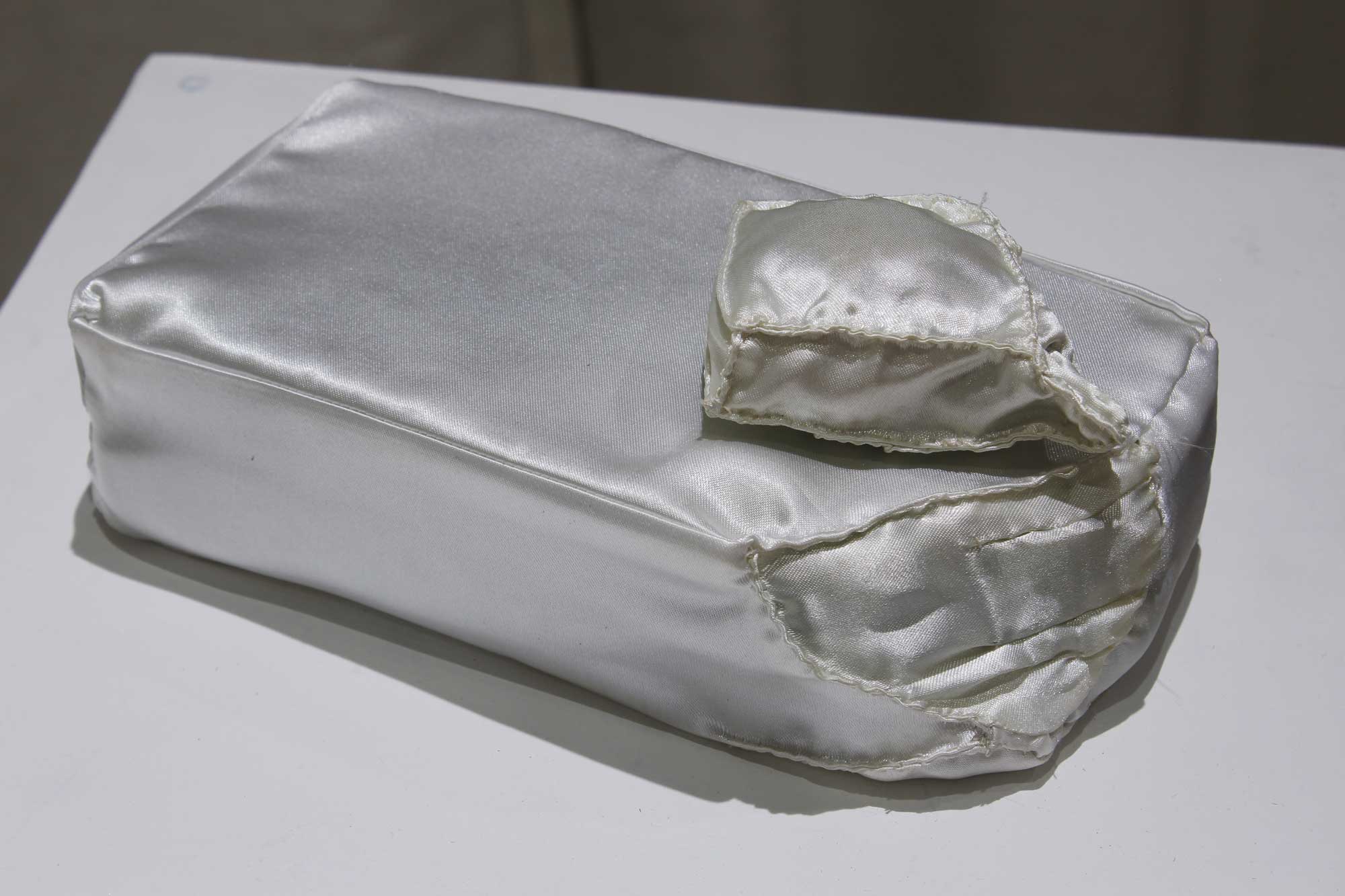 I use white satin for its associations with wedding dresses, opera gloves, and silky underthings, and of course with whiteness itself. Informed by my own ambivalent, conflicted relationship with white womanhood, I consider how this social category both imprisons and protects those who occupy it, colluding with other forms of whiteness and domination. I am thinking, for example, of how white cis women are positioned as victims, as innocent, or as needing protection, as a way to justify violence that upholds white supremacy, settler colonialism, transmisogyny, etc. Reflecting on the fruitless, never-ending labor of constructing and maintaining womanhood at both an individual and societal level, I have come to think of ‘proper’ white womanhood as a kind of shelter; a hole to crawl into; a “safe space” where some of us may hide and be protected, but which by its very nature must exclude others. This work is about longing for a shelter; knowing any shelter I build will someday collapse; and knowing too that my desire to hide away in safety is itself violent.