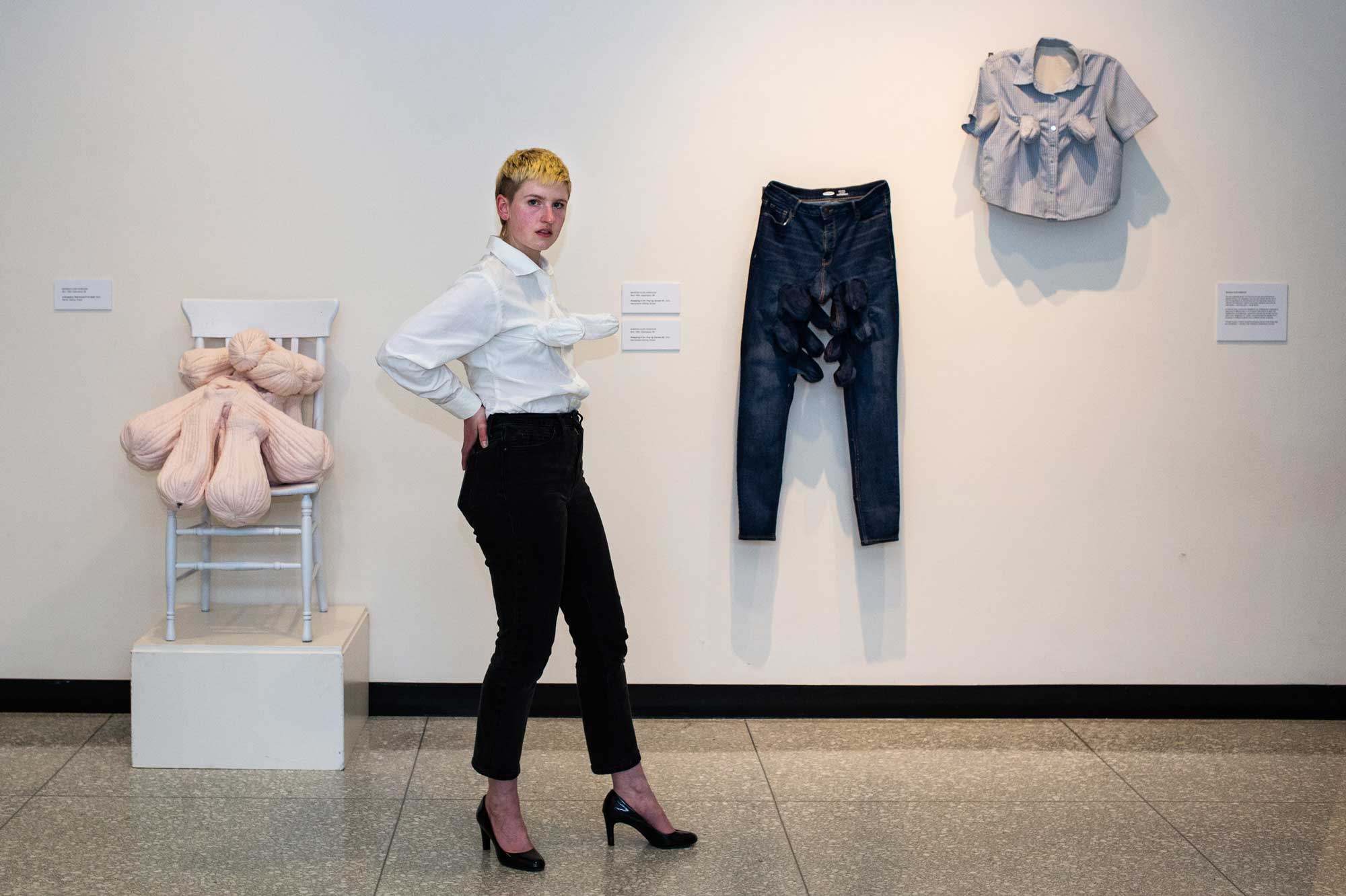 Strapping It On addresses gender and the body through soft sculptures and altered clothing. I am interested in how the body signifies gender, and in how this signification is understood to occur through bodily moments of interiority and exteriority. I seek to pose playful questions about how we read bodies — and body parts — as gendered.