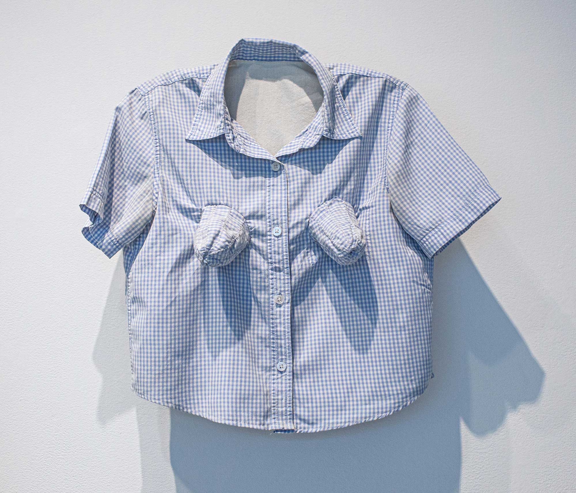 Across this work, I employ two repeated forms, changing their meanings by using them in different ways. In A Sculpture That Could F*ck Itself, the repeated form protrudes when viewed from one side, but recedes from the other. In other works, I re-contextualize the repeated form by placing it in different locations and on different articles of clothing.